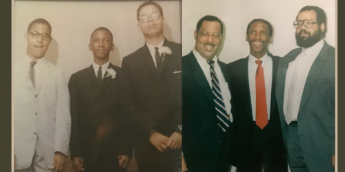 Lynn Gray is on the right in each photo, with his friends Craig Jackson (center) and Fred Risker (left). They are photographed in Detroit at their 8th grade graduation in 1962, and at Fred’s mother’s funeral in 1987.