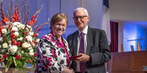 Andrea Luxton, Andrews University president, is presented with her Weniger Medallion | photo credit: Enno Mueller